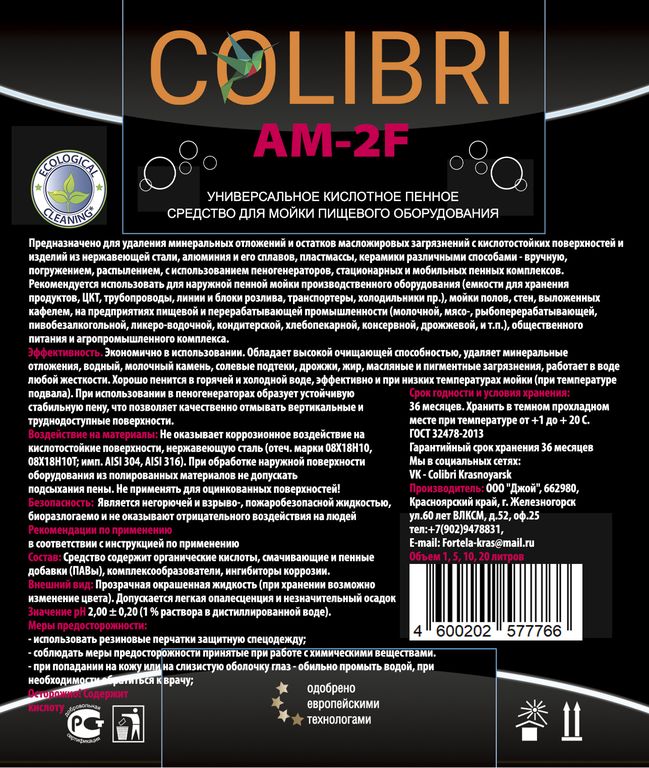 Кислотное пенное средство. Предназначено для удаления минеральных отложений и остатков масложировых загрязнений с кислотостойких поверхностей и изделий из нержавеющей стали, алюминия и его сплавов, пластмассы, керамики различными способами - вручную, погружением, распылением, с использованием пеногенераторов, стационарных и мобильных пенных комплексов. Рекомендуется использовать для наружной пенной мойки производственного оборудования (емкости для хранения продуктов, ЦКТ, трубопроводы, линии и блоки розлива, транспортеры, холодильники пр.), мойки полов, стен, выложенных кафелем, на предприятиях пищевой и перерабатывающей, общественного питания и агропромышленного комплекса.