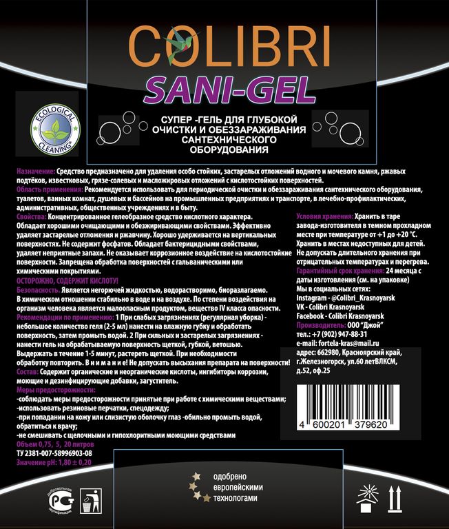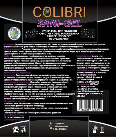 Супер -гель для глубокой очистки и обеззараживания сантехнического оборудования. Средство предназначено для удаления особо стойких, застарелых отложений водного и мочевого камня, ржавых подтёков, известковых, грязе-солевых и масложировых отложений с кислотостойких поверхностей. Концентрированное гелеобразное средство кислотного характера. Обладает хорошими очищающими и обезжиривающими свойствами. Эффективно удаляет застарелые отложения и ржавчину. Хорошо удерживается на вертикальных поверхностях. Не содержит фосфатов. Обладает бактерицидными свойствами, удаляет неприятные запахи. Не оказывает коррозионное воздействие на кислотостойкие поверхности. Запрещена обработка поверхностей с гальваническими или химическими покрытиями.