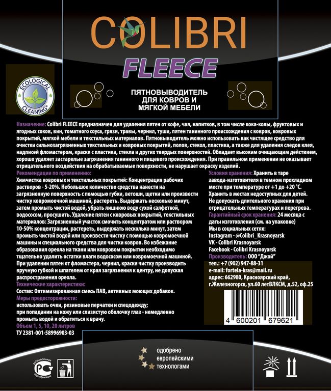 Пятновыводитель Colibri Fleece, 20 литров