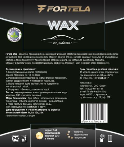 Концентрированный эффективный продукт, защищающий автомобиль от внешних воздействий окружающей среды. Обладает высокой водоотталкивающей способностью, ускоряя процессвысыхания кузова после мойки. Жидкий воск разбавляется водой, наносится на чистую поверхность, высыхает самостоятельно или смывается водой. Эффективно в любое время года.